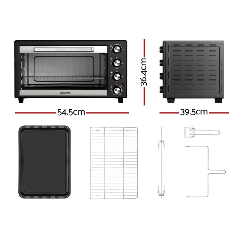 The Devanti 45L Convection Oven Electric Fryer offers versatile cooking with its 1800W power and 45-litre capacity, perfect for baking, grilling, roasting, and frying. Designed for convenience, it features top and base stainless steel heating elements, a rotisserie function, and four adjustable tray positions for precise cooking control. The oven’s tempered glass door and built-in light allow easy monitoring, while the cool-touch handle and heat shield vent ensure safe operation. With a 60-minute timer, automatic shut-off, and non-slip feet, this sleek black and silver oven is ideal for any kitchen or on-the-go cooking.