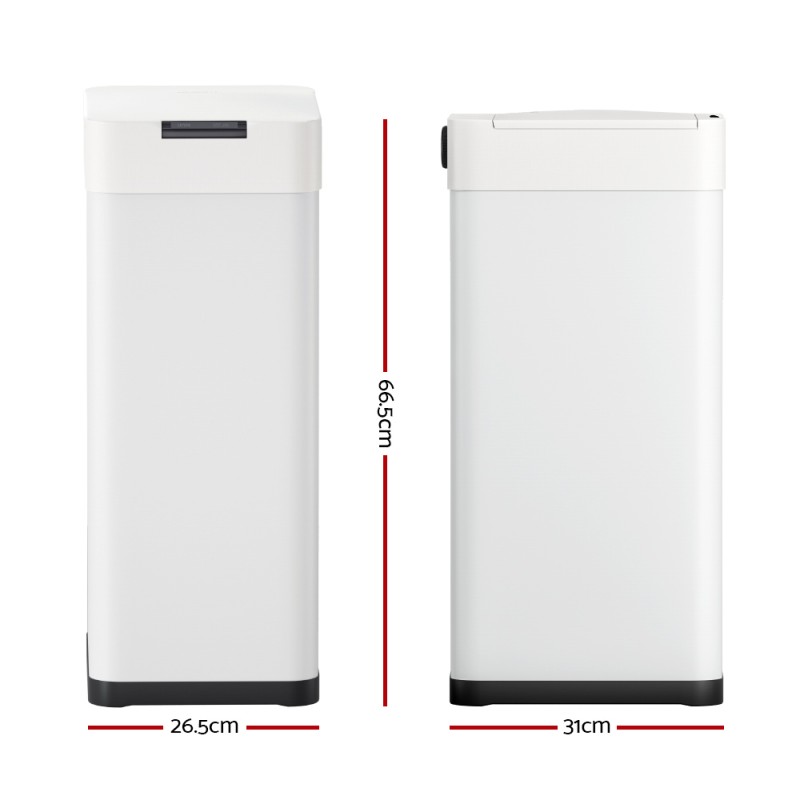 Experience a cleaner, more hygienic home with the Devanti 50L Sensor Bin. This sleek, white automatic trash can features advanced motion-sensor technology, allowing you to dispose of waste effortlessly with a simple wave of your hand within a 20cm range. Its generous 50L capacity minimises the need for frequent emptying, while the fingerprint-resistant iron body keeps your kitchen looking pristine. The convenient bag retaining ring ensures liners stay in place, and the soft-close lid operation is noise-free and odour-sealing. Choose between battery or USB power for versatile operation. Elevate your kitchen hygiene with Devanti.