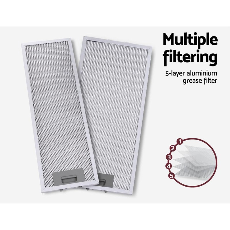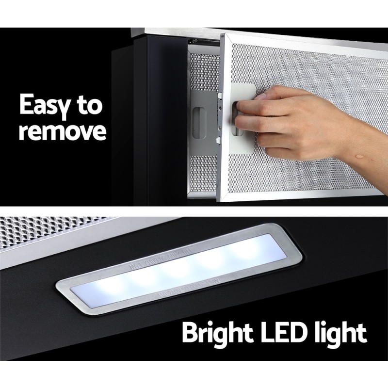 Transform your kitchen into a haven of culinary creativity with the Devanti 600mm Range Hood. Crafted with precision from Grade A stainless steel, this sleek and elegant range hood is designed to eliminate smoke, steam, and odours, ensuring a fresh cooking environment. Its powerful motor and large extraction area provide efficient air clearance, while the two 5-layer washable aluminium grease filters capture grease effortlessly. The sliding mechanism allows for automatic on/off operation, and with dual fan speed control, LED lighting, and easy installation options, this range hood is both functional and stylish.