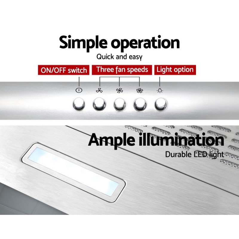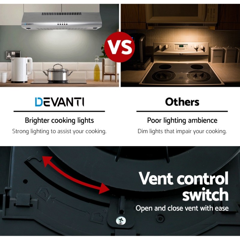 Transform your kitchen into a haven of cleanliness and elegance with the Devanti 600mm Stainless Steel Range Hood. Designed to effortlessly eliminate cooking odours and smoky fumes, this range hood boasts a sleek, slim body crafted from Grade-A stainless steel. Its high-performance motor ensures a powerful upflow and efficient extraction, while the 3-speed touch controls allow for customization to fit your cooking needs. The non-stick 5-layer aluminium filter is both removable and durable, making maintenance a breeze. Illuminate your culinary creations with the built-in LED lamp, and choose between ducted or recirculated installation to best suit your kitchen setup. Experience the perfect blend of style and functionality with the Devanti Range Hood today.