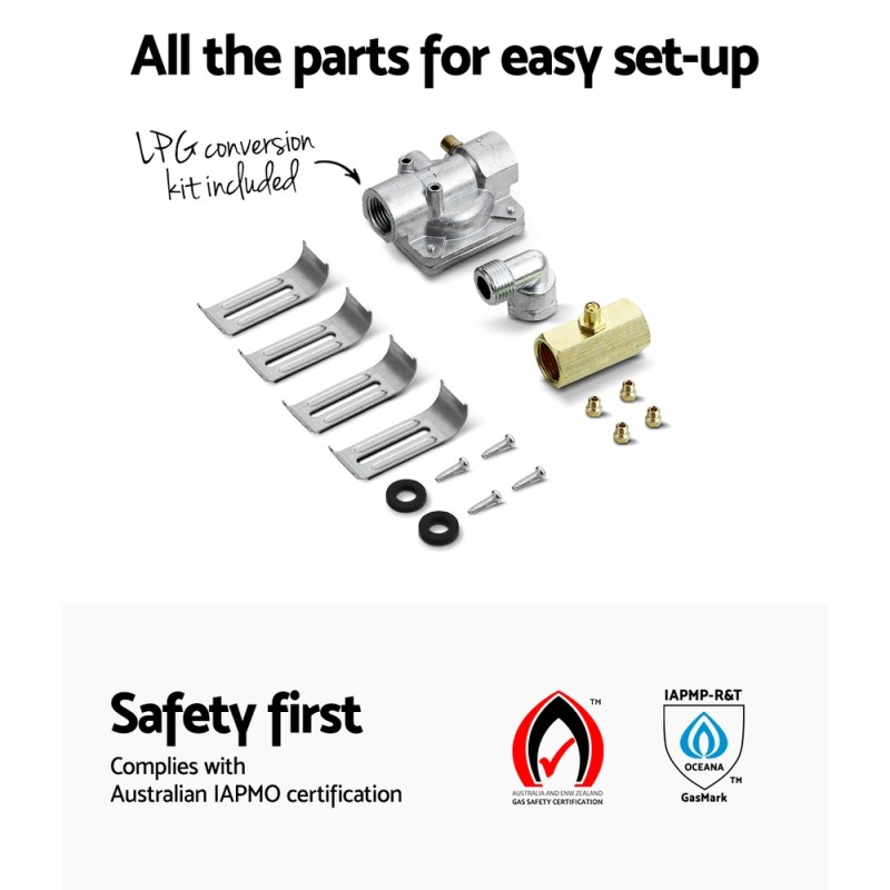 Whether you're setting up a new home or upgrading your current kitchen, the Devanti Gas Cooktop 60cm with 4 Burners is your ideal partner for effortless cooking. It boasts a sleek stainless steel design and chef-friendly features like easy ignition, powder-coated knob controls with a safety lock, and a flame failure safety device. The cooktop includes two semi-rapid burners, one wok burner, and one auxiliary burner, offering varied power levels for perfect culinary creations. Durable cast iron grates ensure stability, and a pan support is included for the auxiliary burner. It's factory set for natural gas but easily converts to LPG with the included kit, promising safe and sophisticated cooking for your kitchen.