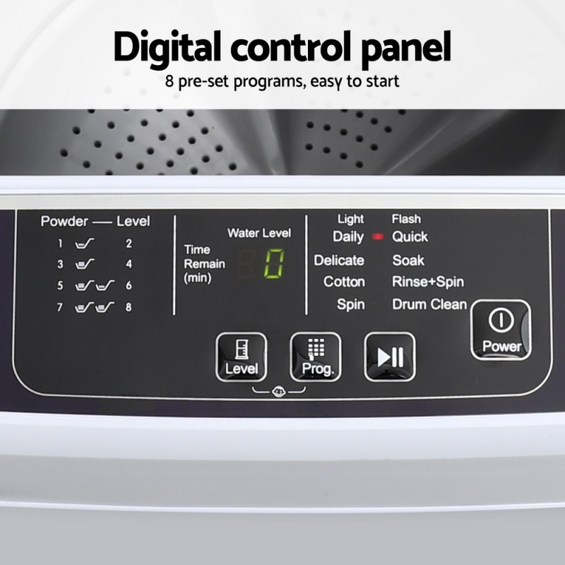 Make laundry effortless with the Devanti 6kg Top Load Washing Machine. Featuring eight versatile programs, a powerful tub washing function, and a 20-minute quick wash, it ensures your clothes are cleaned efficiently. The digital control panel, time remaining display, and stainless steel tub offer convenience and durability. With a safety child lock, large lint filter, hose hook for storage, and overheating control, this washing machine is a reliable and safe addition to any home. Enjoy peace of mind with a 1-year warranty.