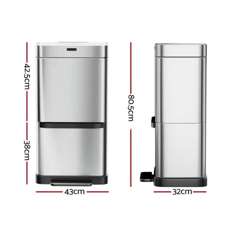Introducing the Devanti 70L Motion Sensor Bin, a sophisticated solution for maintaining a clean, tidy, and germ-free home. Effortlessly dispose of waste with its sensor-activated lid or foot pedal for hands-free operation. Boasting a spacious 70L capacity, this bin is designed with dual compartments for efficient waste and recycling separation, complete with a removable divider. Its sleek, fingerprint-resistant stainless steel finish ensures your kitchen stays shiny and bright. Enjoy noise-free, soft open and close functionality, and keep liners securely in place with the convenient holder. Powered by 4 AA batteries (not included), this elegant bin is not only practical but also environmentally conscious, making it an essential addition to your modern home. Comes with a 1-year warranty.