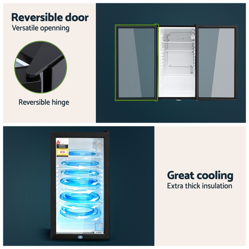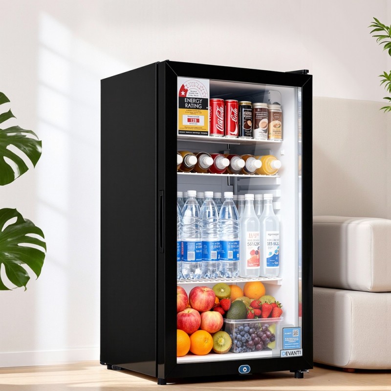 Introducing the Devanti 78L Bar Fridge, a sleek and compact solution for keeping your favourite foods and beverages perfectly chilled. Ideal for small spaces, this mini fridge features six adjustable temperature settings and energy-efficient cooling, ensuring your items stay fresh. The double-glazed door not only enhances insulation but also provides a clear display of contents. With adjustable shelves, height-adjustable feet, and a built-in LED lamp, this fridge offers convenience and functionality. Plus, a built-in lock adds security, making it perfect for home or retail use. Enjoy quiet, hassle-free operation and a stylish, black exterior that complements any setting.