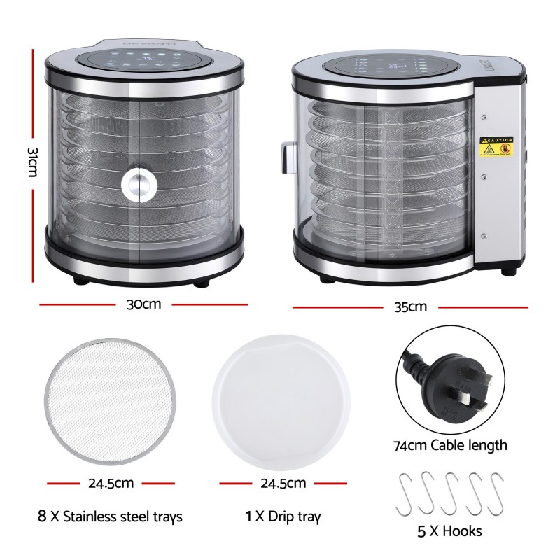 Introducing the Devanti 8-Tray Food Dehydrator, your ultimate kitchen companion for creating delicious dried snacks. Equipped with a 360-degree auto-rotate system and a clear-view window, this dehydrator ensures consistent heat distribution and easy monitoring. With 10 preset programs and customised settings, it caters to a variety of foods, from fruits to meats. The durable stainless steel build features 8 trays and 5 hanging hooks for versatile drying options. Safety is assured with overheating protection, while removable trays and anti-slip feet offer convenience and stability in your kitchen.