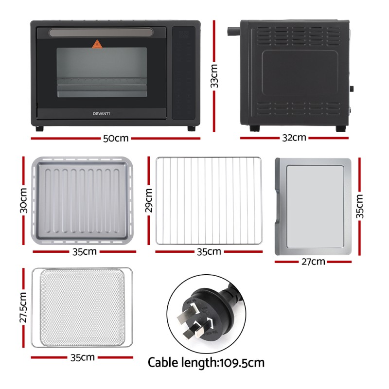 Unleash your culinary creativity with the Devanti Air Fryer 32L W/ LCD Touch Oven. This 1700W powerhouse is designed for family feasts and meal prepping, featuring a spacious 32L capacity. Choose from 16 pre-programmemed settings for crispy fries to perfectly roasted vegetables. The 360-degree air circulation ensures even cooking, while the adjustable temperature range of 35°C-200°C and 90-minute timer offer precise control. The built-in light allows easy monitoring, and the sensor touch control panel with a cool-touch handle ensures effortless operation. The non-stick coating pan and heat shield vent enhance safety and convenience. Plus, with a bonus accessory kit, including an air fry basket, drip tray, oven rack, and crumb tray, it offers versatility for all your air frying needs. Enjoy peace of mind with a 1-year warranty.