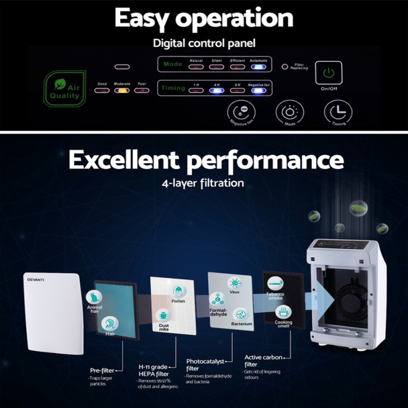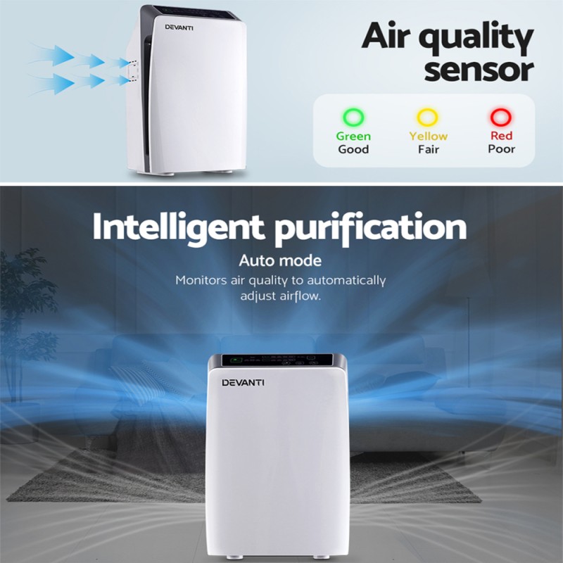 Experience fresher, cleaner air with the Devanti Air Purifier. Equipped with a 4-stage HEPA filtration system, it removes 99.97% of allergens and particles as small as 0.3 microns. The built-in ioniser enhances purification by releasing negative ions. Easily control settings with the digital panel or remote. The air quality sensor provides real-time updates with coloured indicators. Choose from 4 modes, including a Silent sleep mode for quiet operation. The purifier is perfect for spaces of 20-30 sqm, featuring a convenient handle, 8-hour timer, and filter change indicator. Enjoy a breath of fresh air anytime with Devanti.
