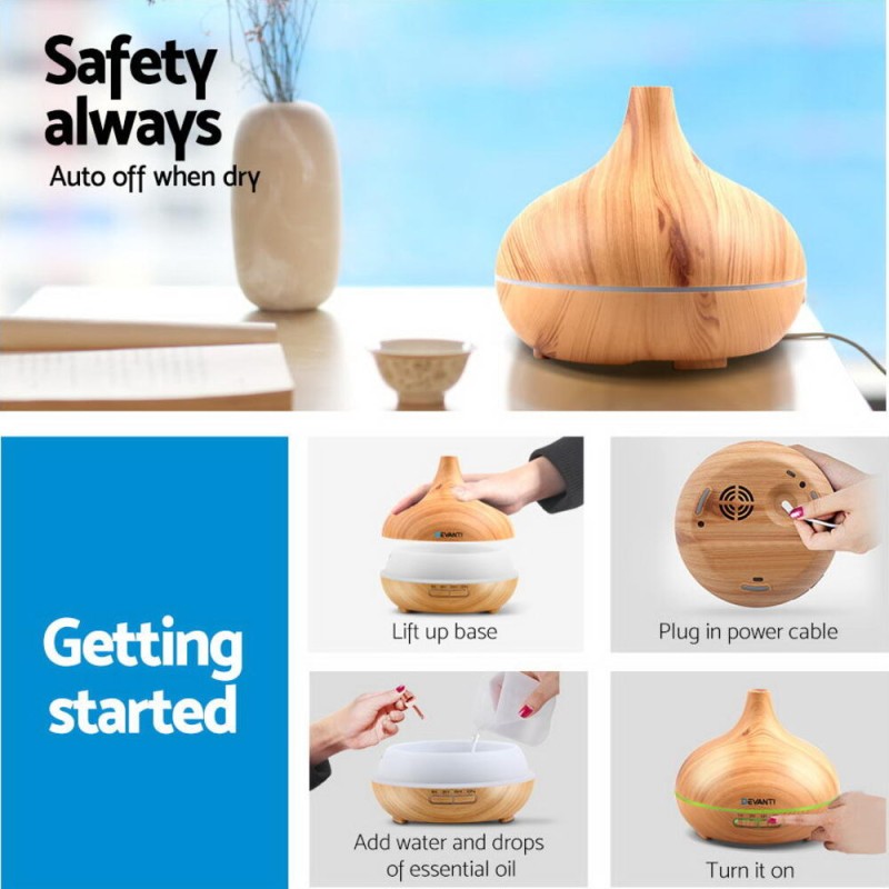 Embrace tranquility and wellness with the Devanti Aroma Diffuser Aromatherapy Humidifier. Designed with a sleek light wood grain finish and zen-inspired shape, this 4-in-1 device functions as a humidifier, purifier, night light, and aromatherapy diffuser. Its ultrasonic technology delivers a soothing mist, enriched with essential oils to refresh your space. Customise your experience with three timer settings, two mist modes, and a 7-colour LED light. Whisper-quiet and efficient, it’s your gateway to a calmer, healthier lifestyle.