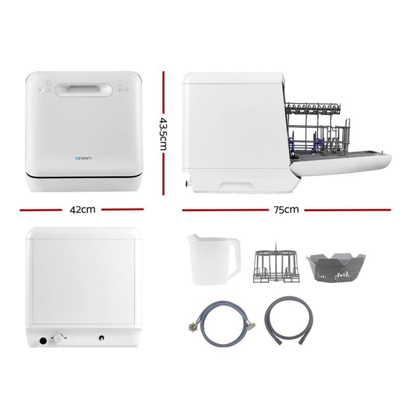 The Devanti 3 Place Settings Benchtop Dishwasher offers exceptional cleaning power in a compact design. With touch controls and an LED display, choose from four programmes, including a 29-minute rapid wash and a baby care cycle. Its 360° spray ensures thorough cleaning, while the automatic ventilation system keeps dishes dry for up to 72 hours. Add water manually or via tap, making it versatile and installation-free. Perfect for small spaces, it also includes a bonus fruit basket and bottle holder.