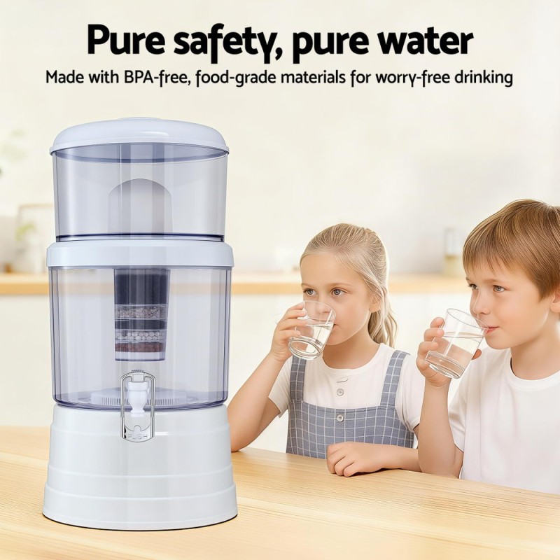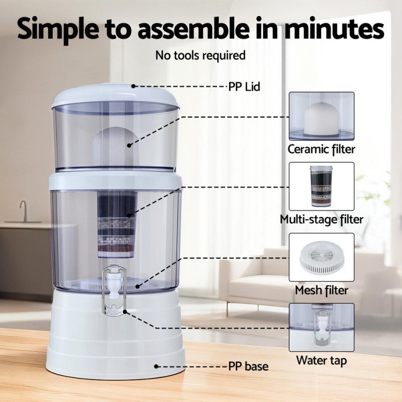 Experience the ultimate in water purification with the Devanti Bench-top Water Filter 16L Gravity Multi-Stage BPA-Free system. Perfect for home, office, or outdoor adventures, this filter transforms tap or collected water into pure, mineral-rich hydration without the need for electricity or plumbing. Made from BPA-free, food-grade materials, this eco-friendly and cost-effective solution is both safe and sustainable. Its large 16L capacity and advanced multi-stage filtration ensure clean water all day, while the compact design makes it easy to assemble and maintain. Enjoy peace of mind with every refreshing sip, wherever life takes you.