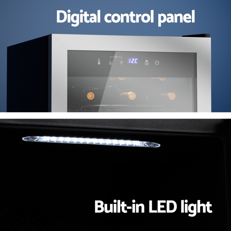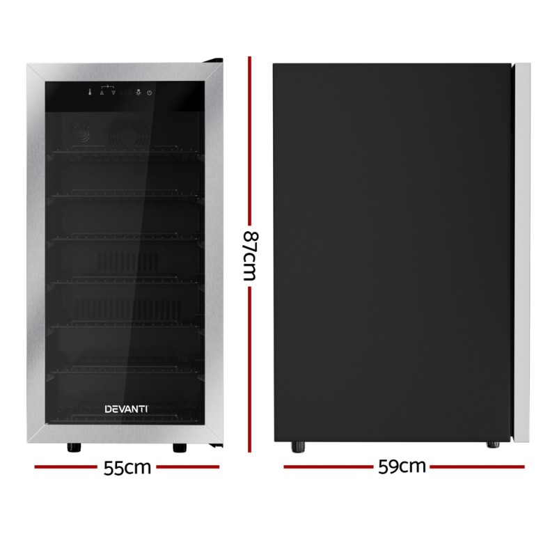 Experience the essence of fine wine with the Devanti Wine Fridge Cooler, designed to store up to 42 bottles with precision and elegance. Its contemporary design pairs seamlessly with any decor, while the advanced 360-degree cooling system, UV-resistant glass, and built-in LED lighting ensure your collection is showcased and preserved at its finest. Whether building a collection or enjoying your favourites, serve them perfectly with Devanti.