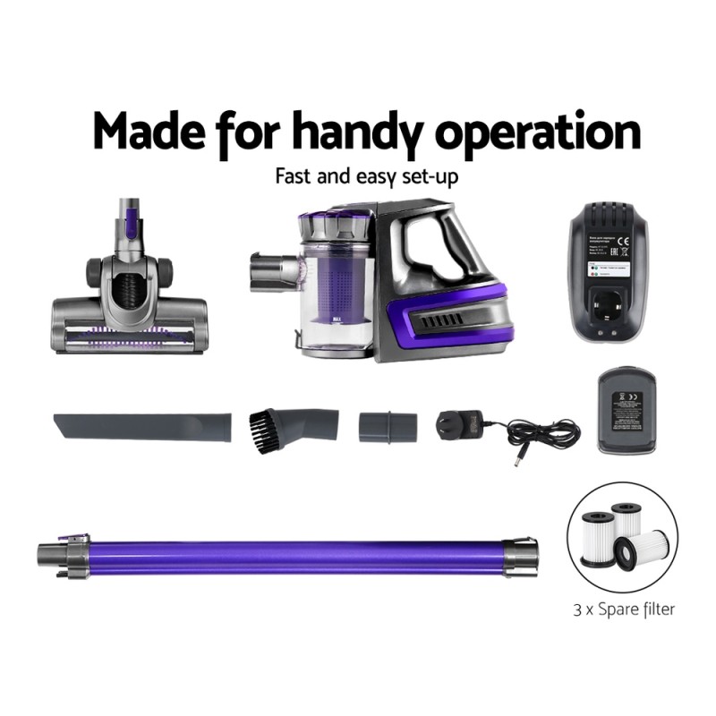 Introducing the Devanti Stick Vacuum Cleaner Cordless HEPA Filter in Purple—a versatile cleaning solution that effortlessly transitions from a stick to a handheld vacuum. Powered by a robust 150W motor with 30000rpm, it delivers consistent suction power up to 8000Pa. Its 160-degree swiveling head and multifunction nozzles make cleaning carpets, rugs, hard floors, upholstery, and curtains a breeze. Designed for convenience, it features a lightweight, one-handed, bagless design with a washable HEPA filter that captures 99.97% of dust and allergens. Enjoy up to 35 minutes of cordless cleaning with its 2000mAH rechargeable battery.