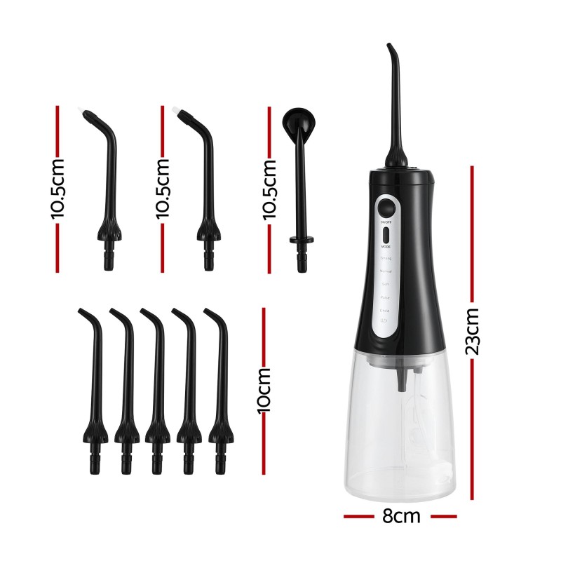 Upgrade your dental care routine with the Devanti Cordless Water Flosser in sleek black. Designed for comprehensive oral hygiene, it's perfect for braces, sensitive gums, and achieving a dentist-fresh feel daily. The 350ml tank ensures uninterrupted cleaning, while five pressure modes range from gentle massages to powerful deep cleans. Equipped with eight specialised tips, it effectively tackles stubborn plaque and gently flushes gum pockets. This water-resistant, rechargeable flosser features a long-lasting battery and modern USB-C charging, making it both convenient and effective for family dental care.
