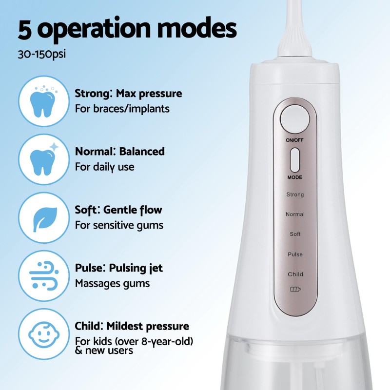 Upgrade your dental care routine with the Devanti Cordless Water Flosser, an advanced oral irrigator perfect for achieving a dentist-fresh feeling daily. Ideal for braces and sensitive gums, this flosser boasts a generous 350ml tank and five custom modes for optimal water pressure. Equipped with eight specialised tips, it tackles plaque and gently flushes gum pockets. Its fully water-resistant design, long-lasting rechargeable battery, and modern USB-C charging port ensure convenience and effectiveness. Make the Devanti Water Flosser your family's go-to choice for a healthier, more confident smile.