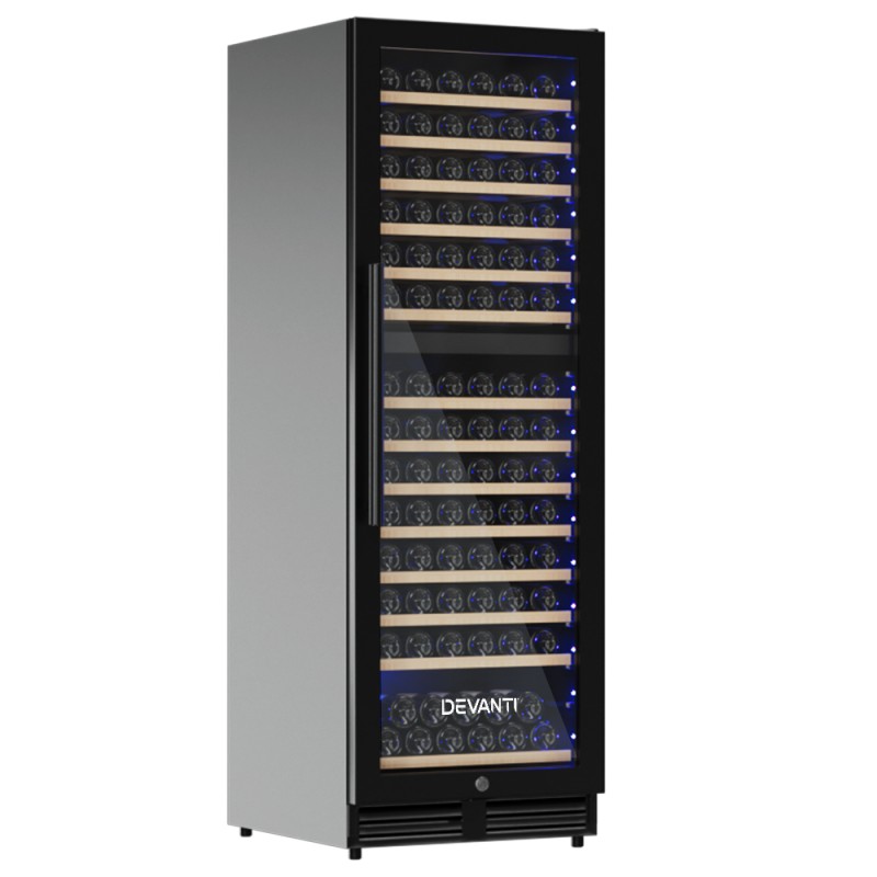 Elevate your wine collection with the Devanti Wine Fridge Cooler Dual Zone, designed to store up to 154 bottles. Featuring advanced Jiaxipera compressor cooling, dual temperature zones (5-13°C upper for whites, 12-18°C lower for reds), a digital control panel, UV-resistant double-glazed glass door, and stylish wooden racks. Silent, frost-free operation with built-in LED lights and lock ensures your wines are preserved and displayed perfectly, ideal for home or commercial use. Includes 1-year warranty.