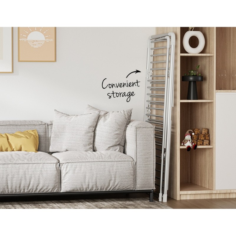 Experience efficient indoor drying with the Devanti Electric Heated Towel Rail Rack. Featuring 30 heated rods, it warms up in just 3-5 minutes, providing a quick, gentle drying solution for your clothes, towels, and baby blankets. Unlike traditional dryers, this rack prevents damage, shrinkage, and creasing, operating silently without the need for vent gas lines. Simply plug it into any standard outlet and enjoy energy savings while avoiding weather worries. Perfect for homes and salons, it folds away for easy storage. Durable with an aluminium build, it supports up to 15kg and comes with a 1-year warranty.