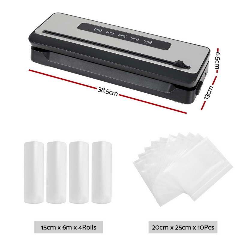 Preserve your food's freshness effortlessly with the Devanti Food Vacuum Sealer Machine. Engineered with 110W power and a robust 60kpa suction pressure, this versatile kitchen gadget ensures an airtight seal without leaks. Its smart touch control system adapts the sealing process for wet, dry, or canister-stored foods, making it perfect for both household and commercial use. Compact and easy to clean, it features a built-in cutter, 4 rolls of vacuum bags, and 10 bonus sealer bags for added convenience. Enhance your food storage solutions today with this reliable and efficient vacuum sealer. Note: Carefully read the instruction manual before use. Enjoy peace of mind with a 1-year warranty.
