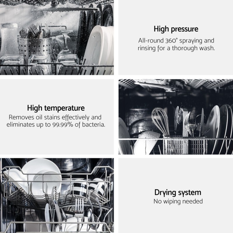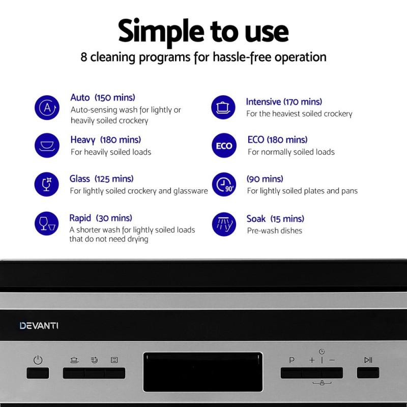 Discover effortless dishwashing with the Devanti 10 Place Settings Freestanding Dishwasher in sleek black. Boasting a large capacity and user-friendly LED display, this dishwasher offers eight cleaning programmes, including delay start and extra drying. Its energy-efficient design, with a 3.5-star MEPS and WELS rating, ensures savings on your bills. Enjoy quiet operation, a removable cutlery basket, and the ability to add forgotten dishes mid-cycle. Elevate your kitchen with Devanti's reliable and efficient dishwasher.