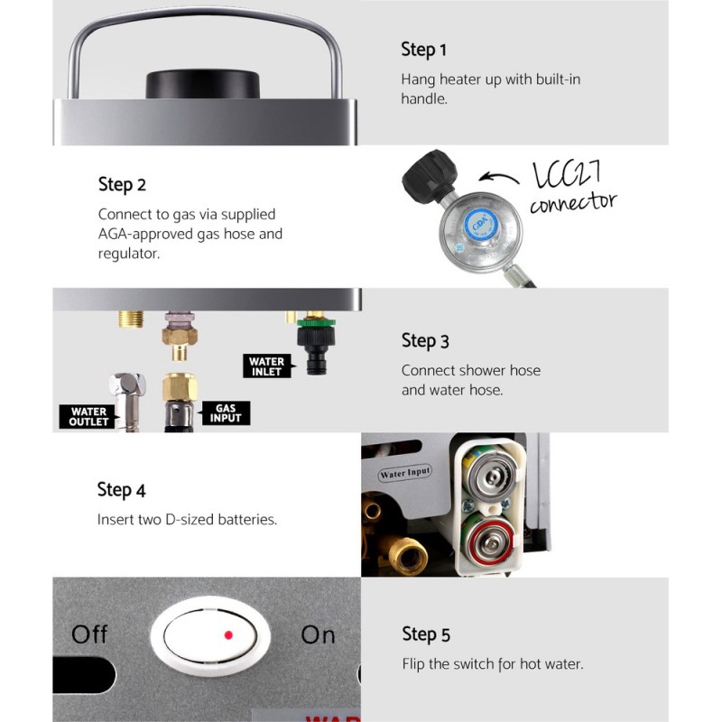 Experience the convenience of warm water anywhere with the Devanti Portable Gas Water Heater. This lightweight and portable unit delivers a consistent flow of up to 8L per minute, perfect for showers, washing dishes, or cleaning pets outdoors. Featuring an easy-to-read LED display, adjustable temperature control capped at 50°C for safety, and a variable flow shower head with an automatic on/off trigger, it ensures comfort and security. Complete with a 12V pressure pump for remote water access, mounting brackets, and a carry handle, it’s your ideal companion for camping and outdoor use.