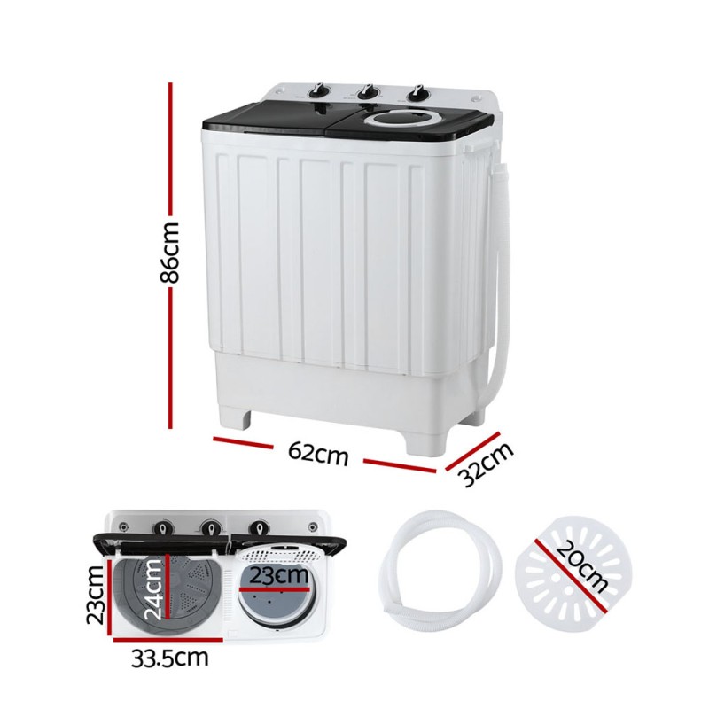Unleash the power of convenience with the Devanti Portable Twin Tub Washing Machine. This compact wonder boasts a 7kg washing capacity and a 4kg spinning capacity, perfect for efficiently handling your daily laundry. Its twin tub design allows simultaneous washing and spinning, powered by a robust dual motor system with 380W washing and 160W spinning power. The intuitive three-knob control panel offers Gentle/Normal/Drain modes for user-friendly operation. With separate timers and a no-installation design, it's ideal for small spaces. Simply plug it in and start your laundry journey with ease.