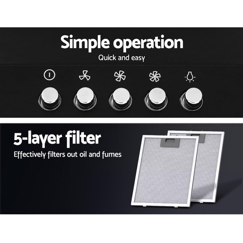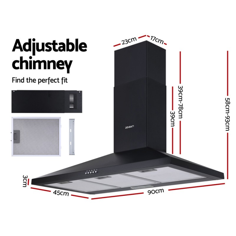 Elevate your kitchen experience with the Devanti 900mm Range Hood. This sleek, black powder-coated steel range hood effectively eliminates smoke and odours with high-performance motors and strong suction power. Easily adjust the 3-speed rocker switch to suit your cooking needs, while LED lighting enhances visibility. Featuring three removable, non-stick 5-layer aluminium filters and an adjustable chimney, this wall-mounted range hood combines functionality with style, ensuring a fresh and clean cooking environment.