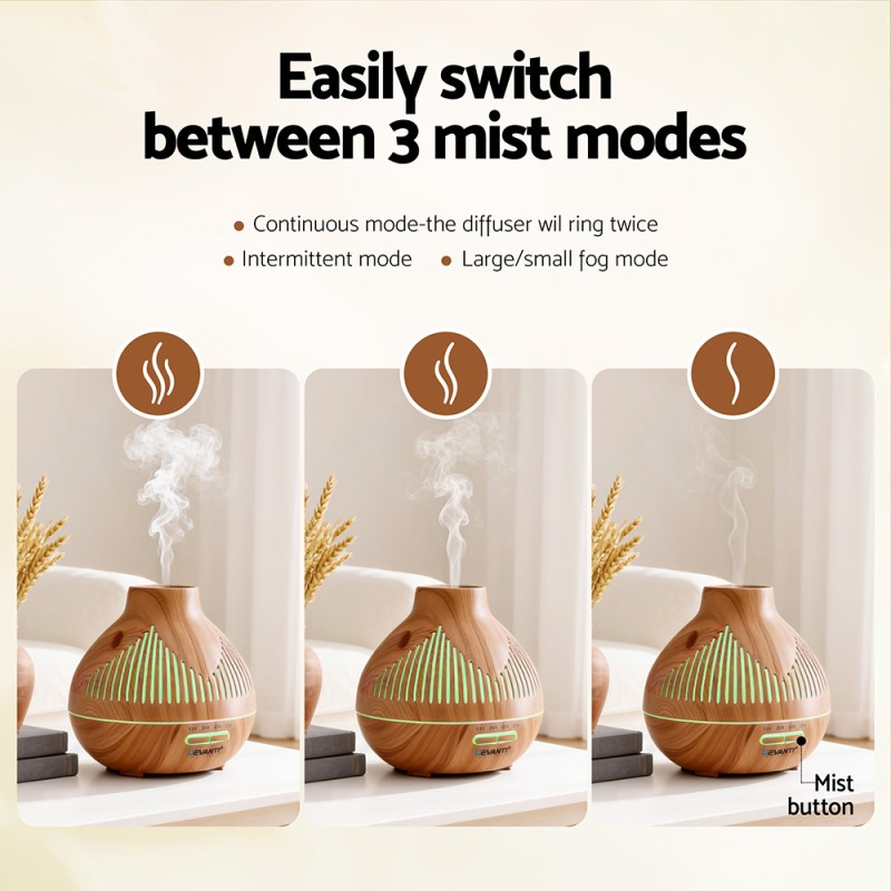 Transform your living space into a serene oasis with the Devanti Ultrasonic Aroma Diffuser. Designed with a natural light wood grain finish, this diffuser offers a 4-in-1 experience combining aromatherapy, humidification, air purification, and ambient lighting. With a generous 400ml capacity, it features 3 mist modes and 3 timer settings to deliver a customised experience. The 7-colour LED light with adjustable brightness levels creates the perfect mood, day or night. Enjoy whisper-quiet operation and peace of mind with automatic shut-off when water runs low, making it ideal for any room or as a thoughtful gift.