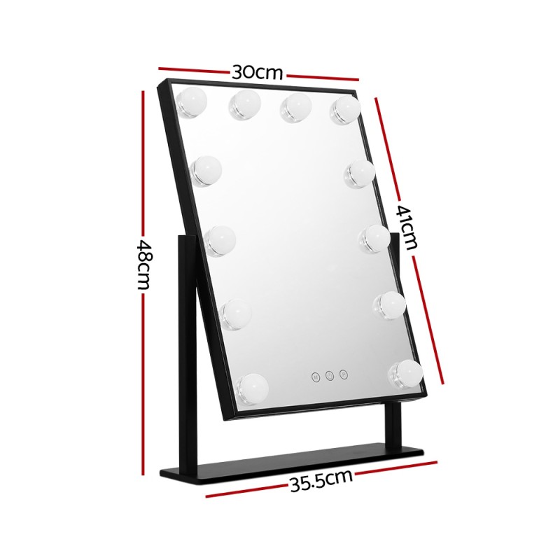 Elevate your beauty routine with the Embellir Makeup Mirror 30x48cm Hollywood Vanity. This elegant mirror boasts a near-frameless design with 12 adjustable LED bulbs, offering both cool and warm white lighting for a flawless reflection. Its 360° rotation and sturdy base provide stability, while touch controls ensure easy use. With a memory function and low heat output, this lightweight mirror is perfect for any vanity. Enjoy the luxury of a professional setup at home with a 1-year warranty.