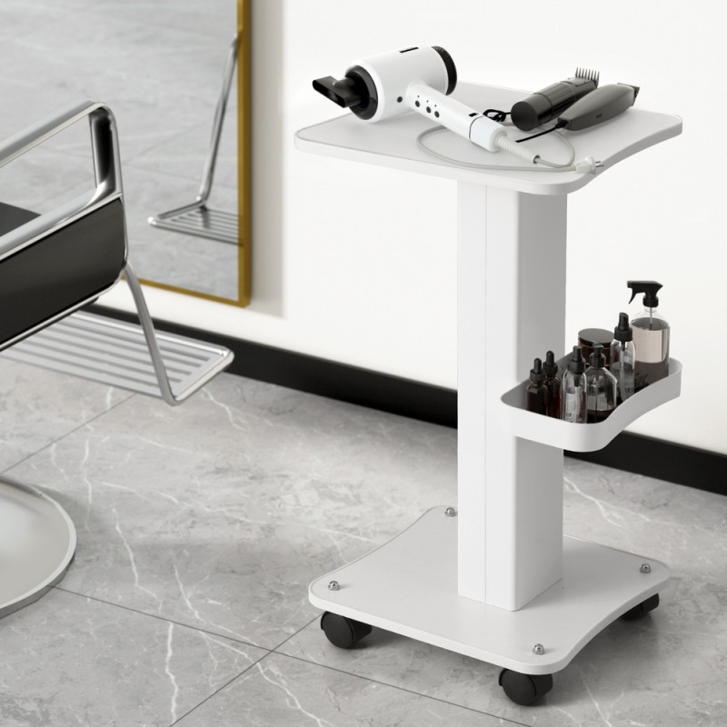 Introducing the Embellir Salon Trolley Cart, a perfect blend of elegance and functionality for beauty salons. Crafted with a sturdy metal frame, this sleek trolley features a multi-functional tray and a desktop with wooden edges for added safety. Its four lockable wheels ensure effortless mobility and stability, making it an ideal choice for busy salon environments. With dimensions of 37.5cm x 34cm x 67.5cm, it supports a desktop weight of up to 50kg and a tray weight of 1.25kg. Assembly required. Comes with a 1-year warranty.