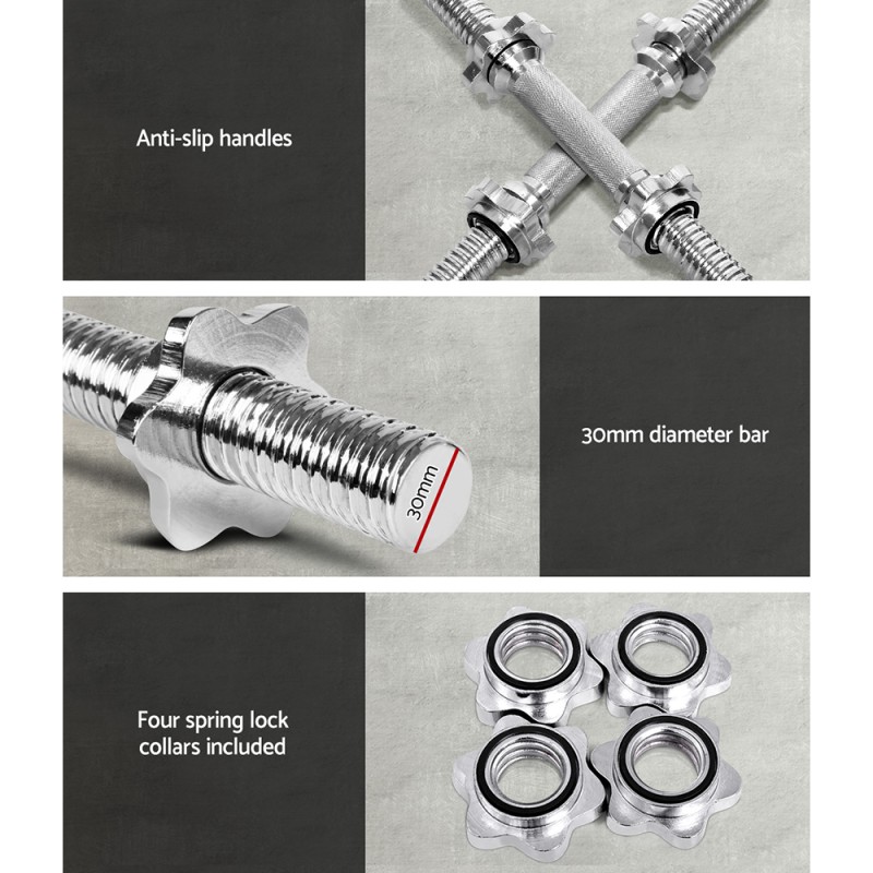 Transform your home fitness routine with the Everfit 45cm Dumbbell Bar. Crafted from solid chrome-plated steel, this durable dumbbell bar is designed to accommodate standard weight plates with 31mm-35mm holes, supporting a maximum weight capacity of 150kg. With 4 bonus spring collars to secure your weights and a knurling design for enhanced grip, you can confidently tackle any workout targeting arms, chest, shoulders, abdomen, legs, or back. Get started on your fitness journey today!