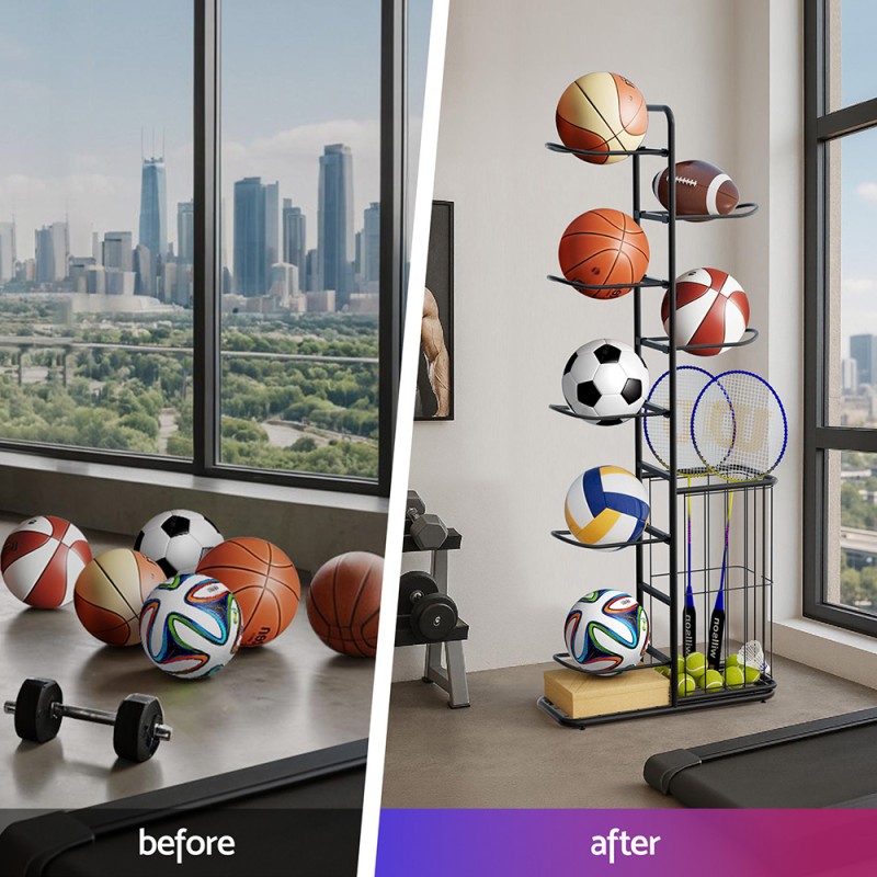 Say goodbye to clutter with the Everfit Ball Storage Rack, the ultimate Sports Equipment Organiser for Aussie families and fitness enthusiasts. Engineered for durability, its heavy-duty steel frame securely holds basketballs, footballs, and volleyballs across a 7-tier rack. A side storage bin neatly accommodates baseball bats, badminton, or tennis rackets, ensuring all gear is easily accessible. Ideal for garages, home gyms, or courts, its compact design fits small spaces, while ventilated baskets reduce moisture buildup. With easy assembly and a sleek black finish, it's perfect for keeping your sports gear tidy and organised.