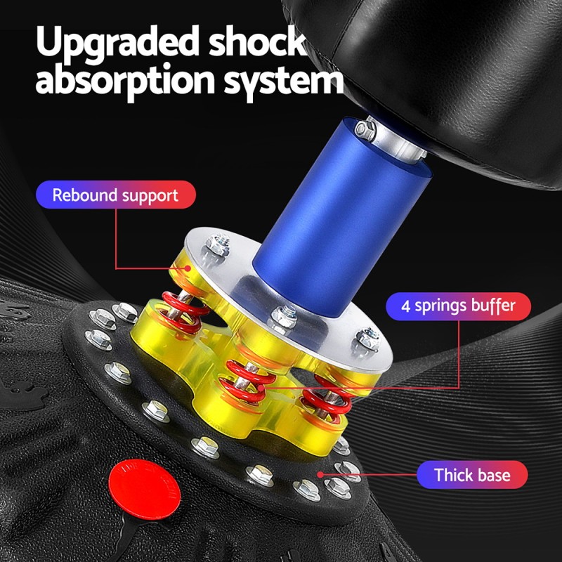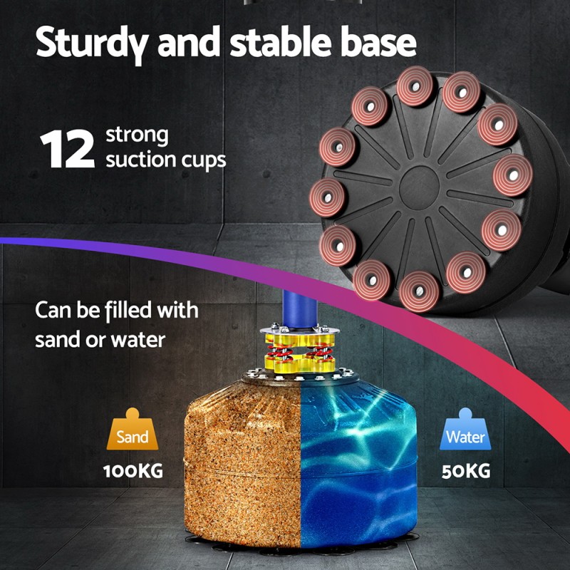 Elevate your boxing routine with the Everfit Boxing Punching Bag Stand, designed for home gym enthusiasts. Crafted from durable multi-layered material, this stand absorbs impact while providing a stable workout environment. Its thick base, secured with 12 robust suction cups, can be filled with water or sand for added stability. Enjoy a quiet training experience with the reinforced shock absorption system, while the high rebound bag ensures quick recovery for continuous practise. Easy to install and maintain, this stand is perfect for relieving stress and enhancing fitness.
