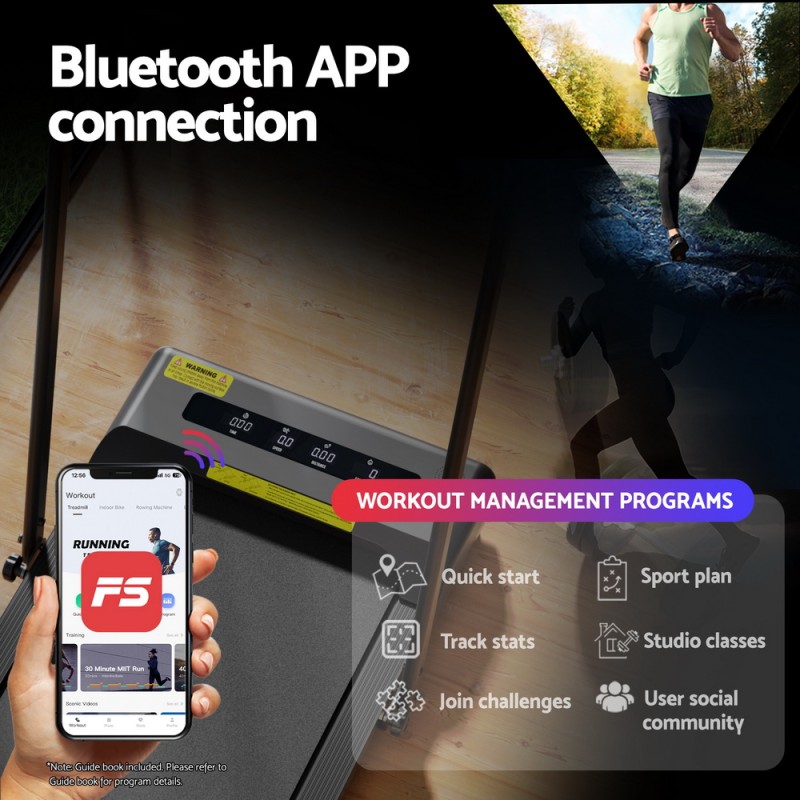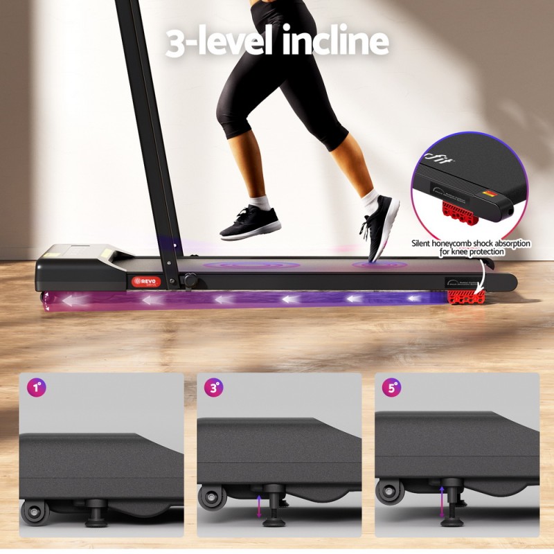 Transform any room into a fitness haven with the Everfit Treadmill Electric Walking Pad Incline Under Desk 380mm Black. Perfect for the busy Aussie lifestyle, this sleek treadmill requires no assembly and folds flat for easy storage. Powered by a quiet, energy-efficient motor, it features three inclines to intensify your workouts. Control your pace with a remote or Bluetooth app, and track your progress on your device. The wide, cushioned belt ensures a safe, comfortable walk, while built-in speakers and a phone holder keep you entertained. Certified safe with shock absorption and easy mobility, it's your ticket to active living.