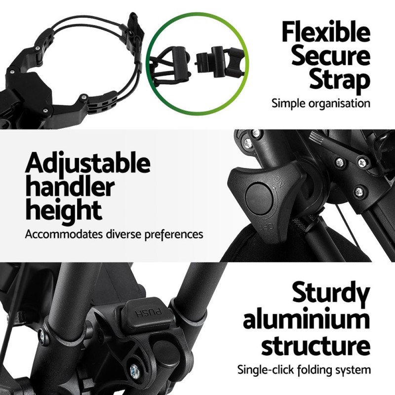 Streamline your golf game with the Everfit Golf Buggy. This foldable trolley features a sturdy aluminium structure, four smooth-rolling wheels, and a convenient single-click folding mechanism for easy portability. Organise your essentials with the integrated mesh net, umbrella stand, and cup holder. The adjustable handle ensures personalised comfort, while the secure elastic strap and foot brake keep your equipment safe and stable on any course.