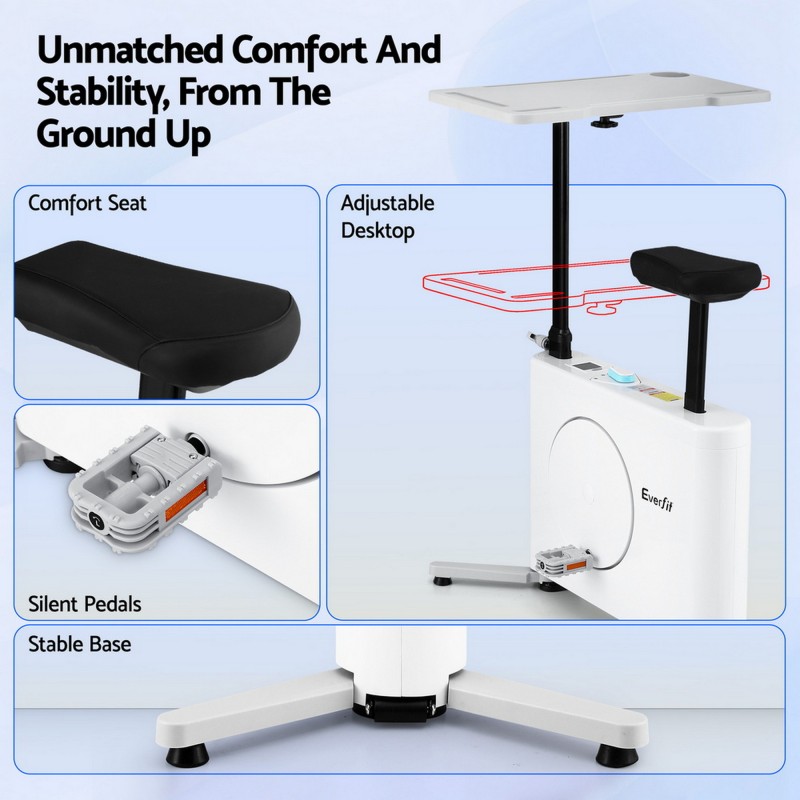 Transform your work-from-home routine with the Everfit Exercise Bike Magnetic Desk Bike with Tabletop. This innovative 3-in-1 workstation bike allows you to seamlessly blend productivity and fitness. Perfect for Aussie homes, it features a height-adjustable ergonomic seat and a fully adjustable desktop, ensuring comfort during long sessions. The 8-level magnetic resistance and whisper-quiet ride make it ideal for any living space. Stay motivated with the digital performance monitor that tracks your stats, while integrated holders keep essentials like your phone and drink within reach. Compact and portable, this bike is the ultimate solution to combat sedentariness while saving space.