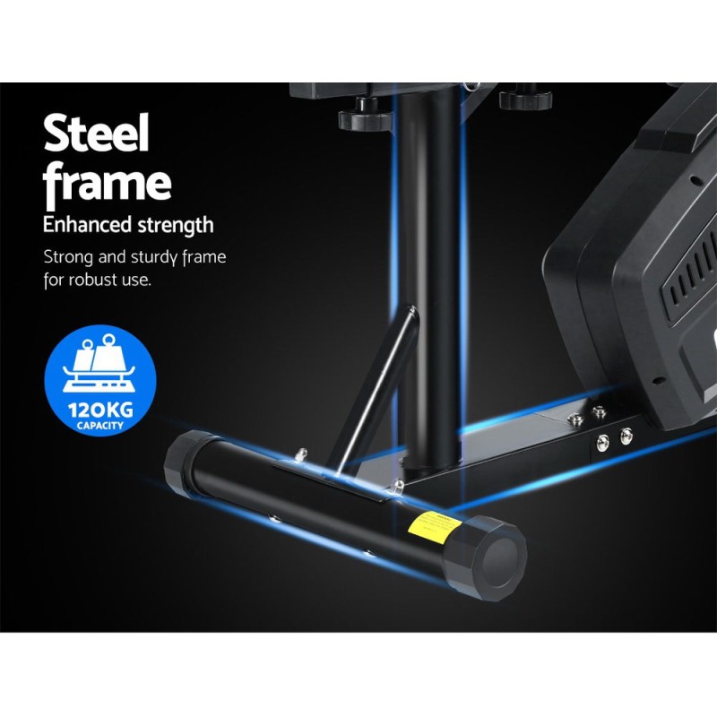 Experience the ultimate home workout with the Everfit Exercise Bike Magnetic Recumbent. Perfect for low-impact cardio, it offers a relaxed seating position to minimise stress on joints while promoting efficient blood flow. With an industrial-strength powder-coated steel frame, this bike boasts durability and rust resistance. Enjoy a silent workout with its magnetic flywheel and customise your intensity with 8 resistance levels. Track your progress on the LCD monitor and benefit from the comfortable, adjustable seat and non-slip feet. Easily transportable with built-in wheels, it's the ideal fitness solution for any home gym.