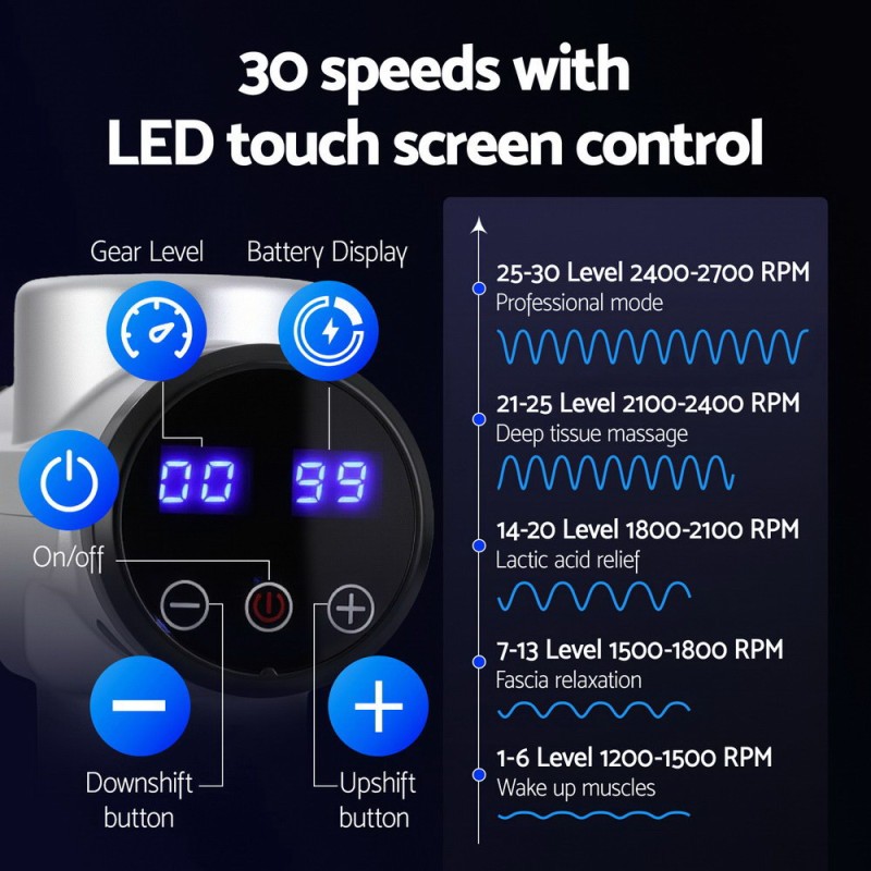 Discover unparalleled muscle relief with the Everfit Massage Gun. Ideal for gym enthusiasts, office workers, or those recuperating from injuries, this device features a high-torque brushless motor for deep relaxation with 1200–2700 strokes per minute. Enjoy 2 hours of use with its efficient rechargeable lithium batteries and customise your massage with 30 speed levels. The quiet operation and non-slip rubber handle ensure a comfortable experience, while the smart touch LED display offers easy control. With six versatile head attachments, tackle fatigue and muscle tension effortlessly. Elevate your recovery with Everfit today!