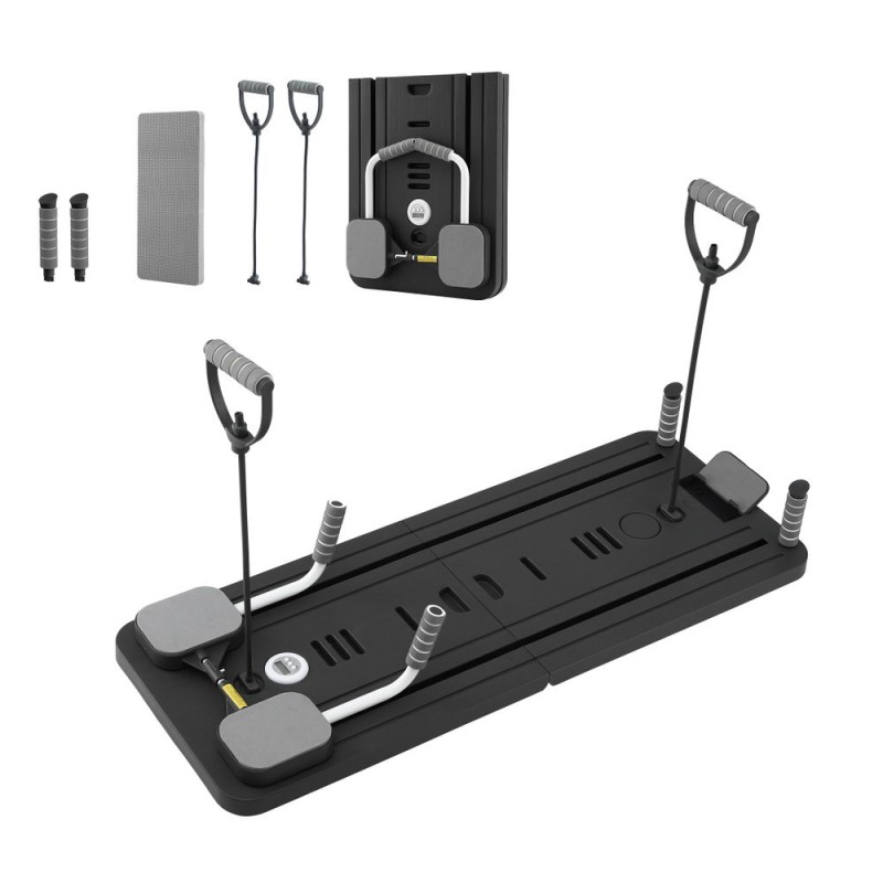 The Everfit Pilates Reformer Abdominal Exercise Board Push Up Set in sleek black is your ultimate fitness companion, offering a full-body workout with the convenience of home use. Its foldable design is perfect for small spaces, delivering studio-quality results without the clutter of bulky gym equipment. Made with high-quality PP material, it boasts a reinforced frame and non-slip handles for unbeatable stability and safety. Designed for core strength and rehabilitation, it includes adjustable resistance bands, a built-in timer, and a cushioned knee pad to suit all skill levels, ensuring reduced joint strain. The carry handle allows for easy transport and storage, making it effortless to train anytime, anywhere. With a recommended weight limit of up to 200kg, this is a secure, long-term fitness investment backed by a 1-year warranty. Note: Button battery for the timer is not included.