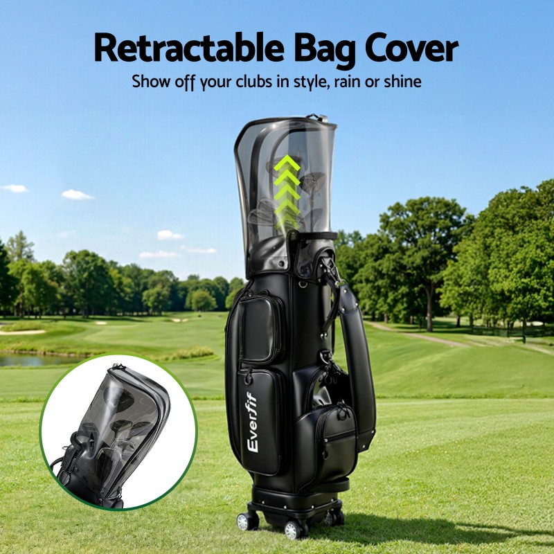 Navigate the course with confidence using the Everfit rolling golf cart bag. Crafted from premium synthetic microfibre leather, this lightweight buggy club organiser features independent club dividers, a clear retractable hood and a hidden telescopic handle for easy manoeuvring. Smooth 360 degree spinner wheels and a stable multi-directional base deliver reliable rolling performance while a built-in insulated cooler pocket and seven specialised compartments keep refreshments and accessories organised and within easy reach.