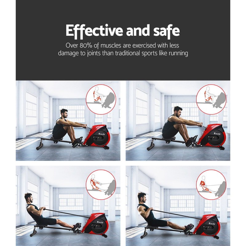 Experience a satisfying workout with the Everfit Rowing Machine, designed for effective home cardio. Utilising a robust elastic-rope system, this rower targets all major muscle groups, helping you achieve well-toned abs, back, and legs. Featuring four levels of manual resistance, you can customise your workout intensity and track progress on the large LCD console. The ultra-quiet operation, anti-slip footrests with adjustable straps, and a commercial comfort moulded seat ensure a safe and pleasant exercise experience. With a durable steel glide rail, a weight capacity of 150kg, and a space-saving foldable design, it’s perfect for any home gym. When you're done, fold and store it effortlessly.
