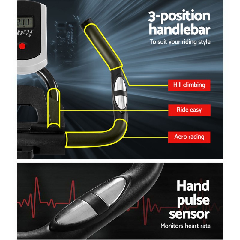 Introducing the Everfit Spin Bike, your ultimate indoor cycling solution that ensures no weather or time constraints disrupt your fitness routine. Engineered with a robust industrial-strength powder-coated steel frame and a 6kg stainless steel flywheel, this bike guarantees a durable and smooth performance. The silent belt drive system provides a noiseless workout experience, while the adjustable resistance lets you customise each session. Comfort is paramount with an extra-thick padded seat and adjustable handlebars. Stay on top of your fitness goals with the onboard LCD monitor displaying six key workout metrics. Effortlessly move and store the bike with built-in transport wheels.