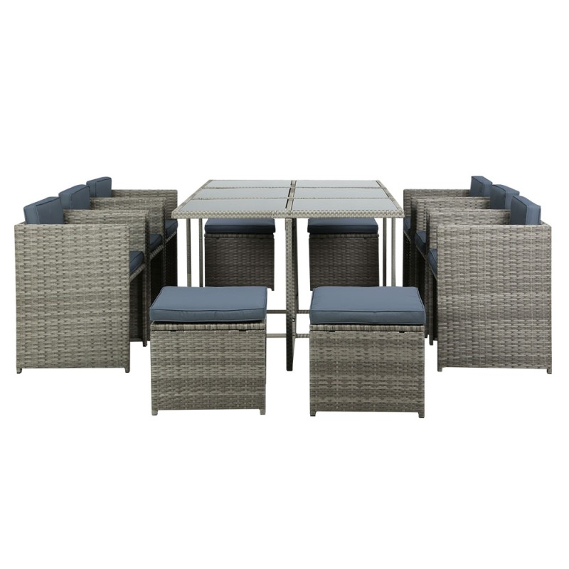 Elevate your outdoor dining experience with the Gardeon 11-Piece Wicker Dining Set. This chic set, seating up to 10 people, includes six chairs, four space-saving ottomans, and a sturdy table with a tempered glass top. Crafted from UV-resistant PE wicker and a weather-resistant steel frame, it promises durability and style throughout all seasons. Enjoy plush comfort with high-density foam cushions and removable, water-resistant covers. Perfect for day-to-night gatherings, this set also features a bonus storage cover.