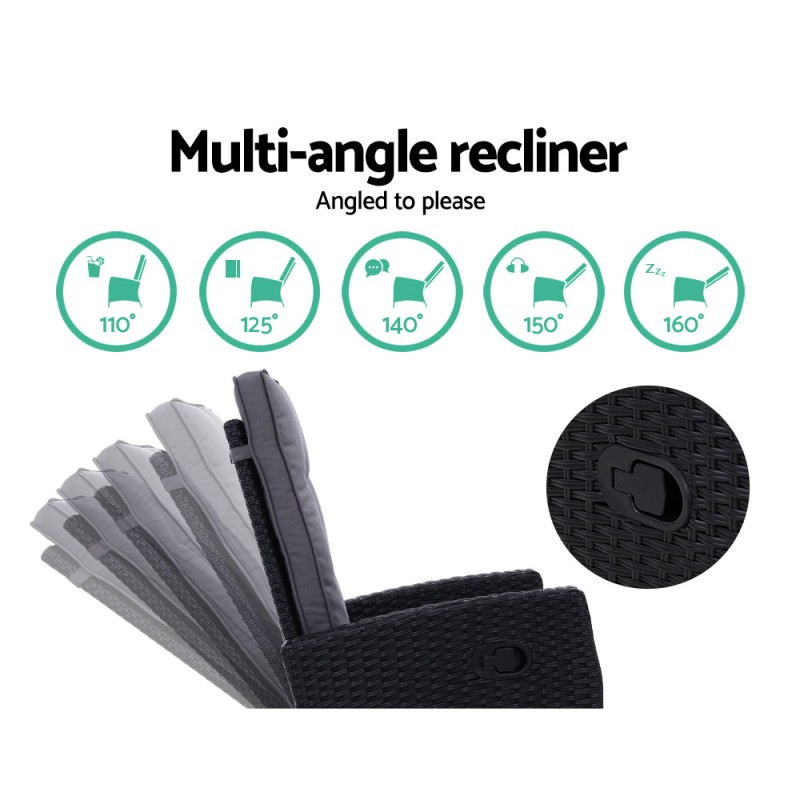 Indulge in pure relaxation with the Gardeon 3PC Recliner Chairs Table Sun Lounge. This elegant, UV and weather-resistant PE wicker set features an oversized recliner with five adjustable angles and a plush high-density foam cushion, ensuring optimal comfort. The sturdy steel frame and non-slip feet enhance durability, while the matching ottoman and tempered glass side table complete the chic ensemble. Perfect for both indoor and outdoor settings, this luxurious set transforms any space into a haven of tranquility.