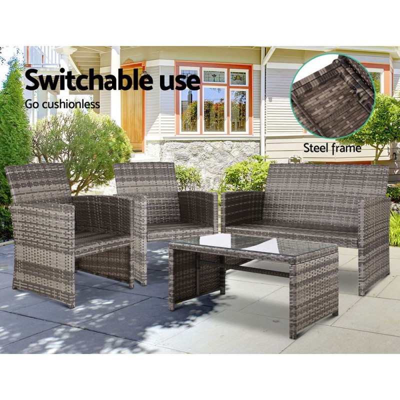 Experience elegance with the Gardeon 4 PCS Outdoor Sofa Set. Featuring sleek lines and exotic grey wicker, it enhances any spaceābe it poolside, on the deck, or indoors. Built with a robust powder-coated steel frame and weather-resistant PE wicker, it includes plush cushions with removable, washable covers. The set's highlight, a matching coffee table, boasts a 5mm tempered glass top. Enjoy comfort and style with easy assembly and UV resistance, ensuring lasting quality.