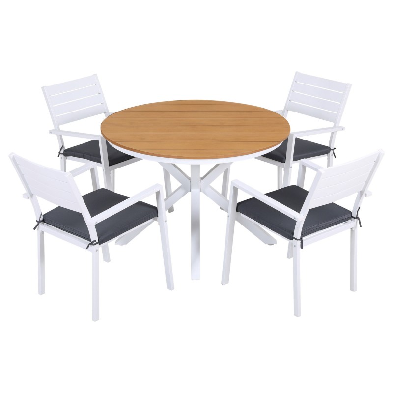 Create a stylish outdoor dining area with the Gardeon 5 Piece Patio Set featuring a round WPC slatted tabletop on a sleek aluminium X base and four stackable aluminium chairs with high backrests and removable washable cushions. Weather resistant and easy to maintain this set suits balconies patios gardens and indoor dining spaces while offering lightweight durability and simple assembly for everyday use and entertaining.