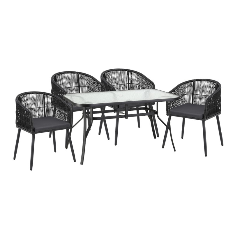 Transform your outdoor spaces with the Gardeon 5PC Outdoor Dining Set. This stylish bistro set, crafted with a rust-proof powder-coated steel frame and UV-resistant wicker, promises both durability and elegance. The spacious tempered glass table includes a built-in parasol hole for added shade, while non-slip feet provide stability on any surface. Perfect for both outdoor and indoor use, the set features removable, washable cushions for easy maintenance. Invite family and friends for delightful gatherings with this versatile dining set, designed for comfort and longevity. Enjoy the seamless blend of function and style with Gardeon.