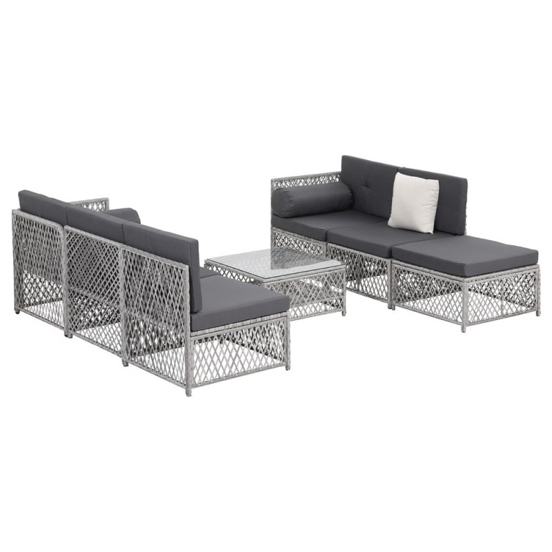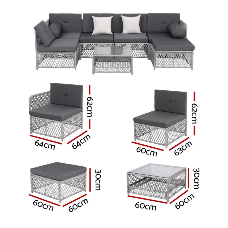 Create a stunning outdoor retreat with the Gardeon 7-piece Outdoor Sofa Set. Designed for versatility and style, this set seats up to six and includes three single sofas, two corner sofas, an ottoman, and a centre table with tempered glass top. Handwoven UV-resistant PE wicker and plush 6cm cushions ensure year-round comfort and durability. The powder-coated metal frame offers strength, while the modular design lets you customise the layout to suit any patio, garden, or indoor space. Elevate your entertaining and relaxation with Gardeon.