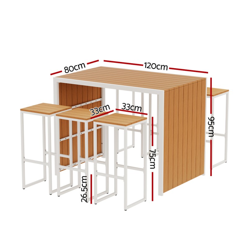 Upgrade your outdoor space with the Gardeon 7-Piece Outdoor Bar Set. This chic and durable set includes 6 chairs and a table, crafted with premium wood slats on a powder-coated steel frame. The neutral colour fits any decor, and built-in footrests ensure comfort. Slide chairs under the table for easy storage. Ideal for indoor or outdoor use, it's easy to assemble and withstands all weather. Enjoy al fresco dining with Gardeon's stylish and functional bar set.