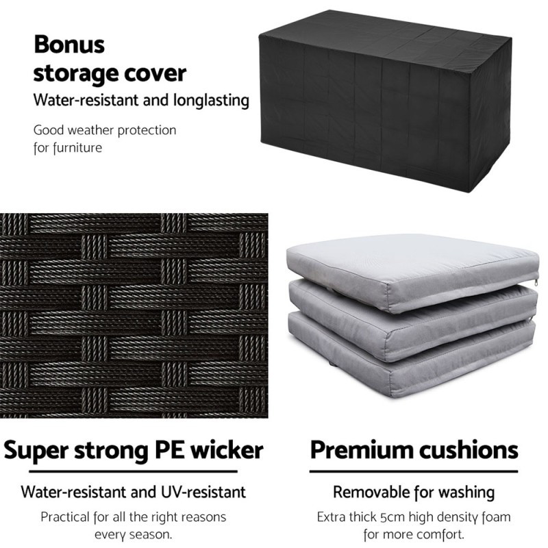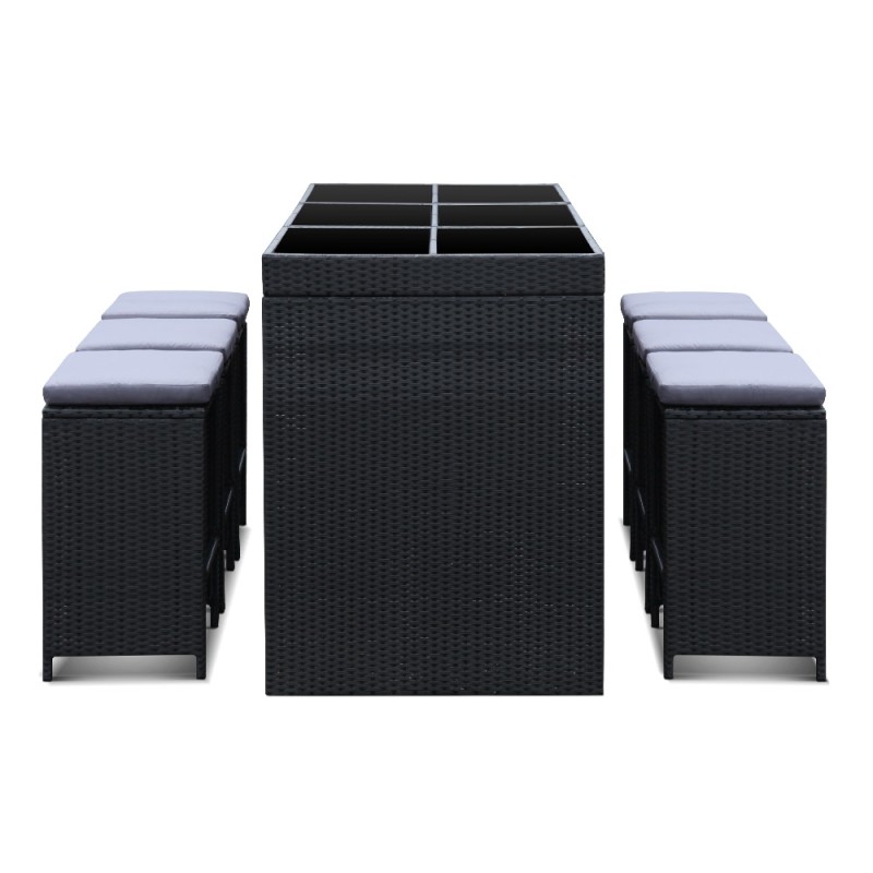 Transform your outdoor space with the Gardeon 7-Piece Outdoor Bar Set, featuring a chic black PE wicker design and sturdy powder-coated steel frame. This stylish set comfortably seats six, with 5cm thick foam cushions for added comfort. The tempered glass table top offers durability, while the integrated design allows stools to be stored underneath, saving space. Weather-resistant and UV-resistant, this set is built to withstand the elements, ensuring years of enjoyment. Perfect for summer gatherings!