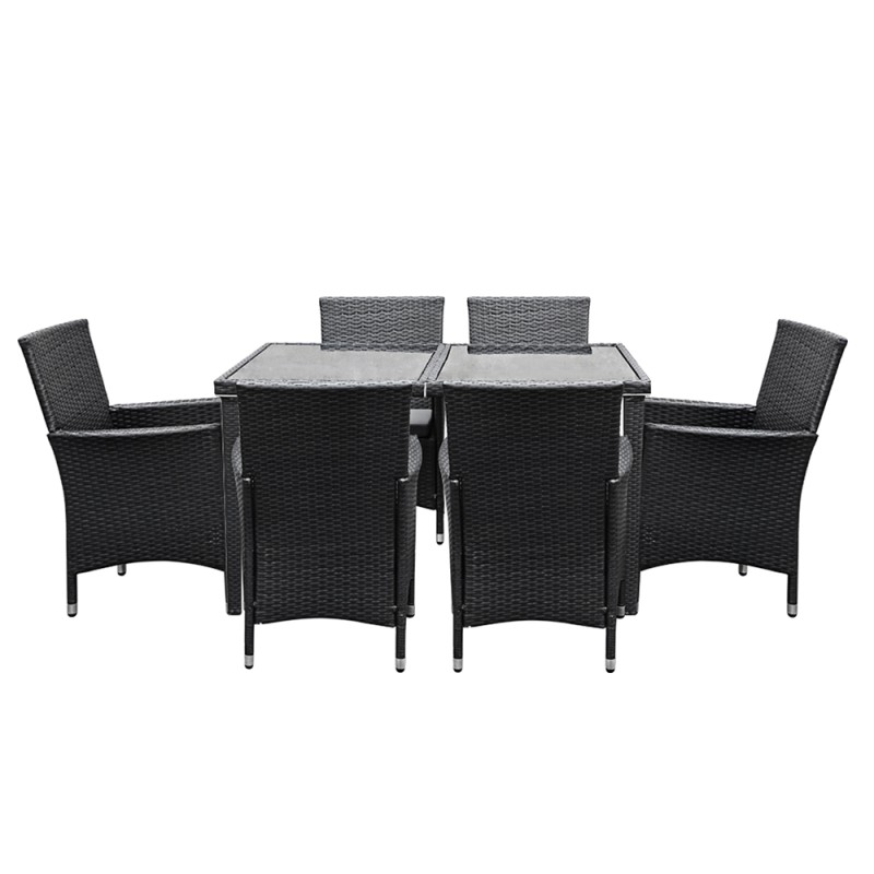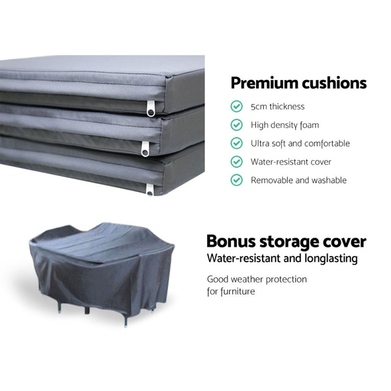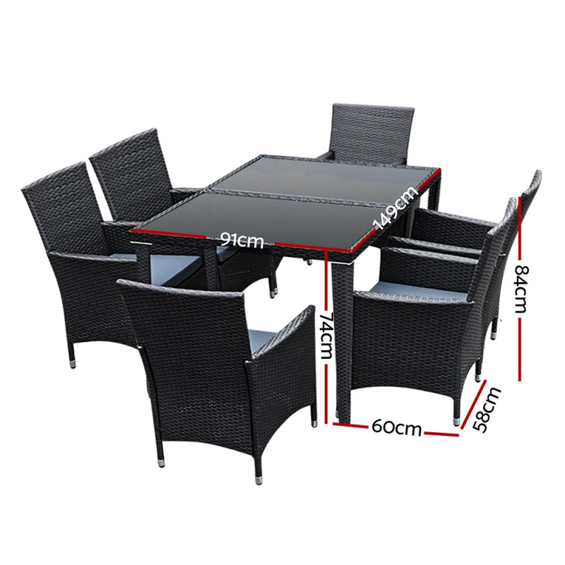 Dine in style with the Gardeon Outdoor Dining Set. Crafted with UV-resistant PE rattan and a durable aluminium frame, this 7-piece set is perfect for any setting. The chairs boast a sleek design with 5cm thick high-density foam cushions for ultimate comfort, while the table features a 5mm tempered glass top for durability. A water-resistant cover protects the entyre ensemble. Elevate your outdoor experience with this elegant and weather-resistant dining set.