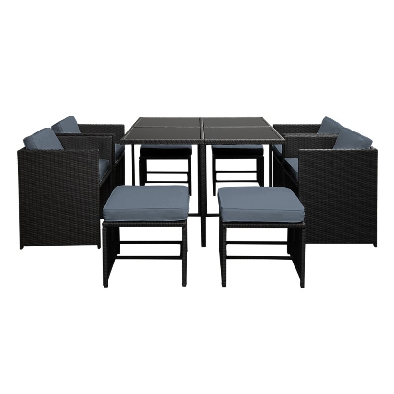 Transform your backyard with the Gardeon Outdoor Dining Set. This 9-piece set features a stylish black powder-coated steel frame and UV-resistant PE wicker. Enjoy a tempered glass table and 8cm high-density foam cushions with removable, washable covers. The set includes a water-resistant cover for easy storage. Perfect for entertaining, this space-saving design is ready for Spring and Summer gatherings. Easy assembly and doorstep delivery make it a must-have for your outdoor space.
